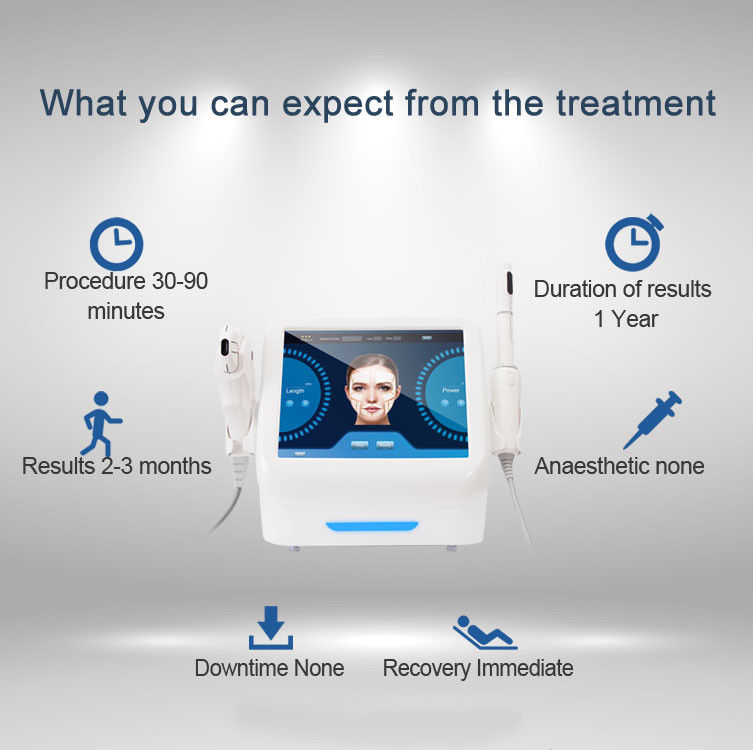 Le système émet l'énergie focalisée d'ultrason au-dessous de la surface de peau pour soulever la couche de peau, serre fondamentalement et peau lisse de rides et de fléchissement. Il est très approprié à traiter et à serrer la peau de la ligne de menton et des sourcils de fléchissement. Il est conçu pour les patients qui ont des attitudes contradictoires envers la chirurgie esthétique, et améliore l'aspect par un non envahissant, aucune méthode de temps d'arrêt.